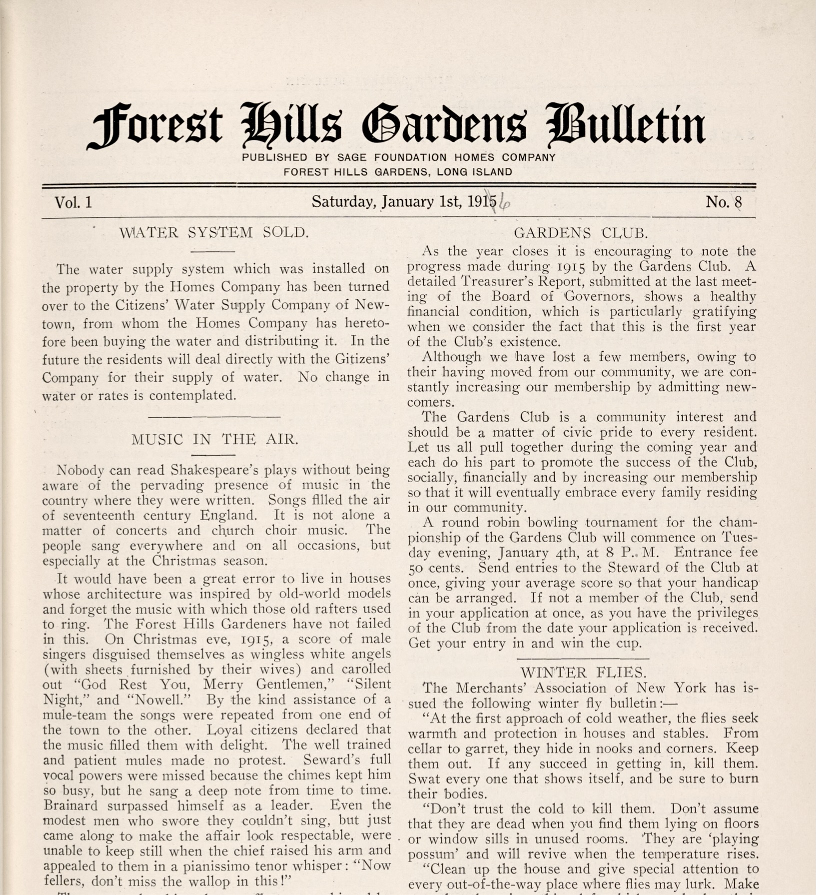 As 1915 concludes, the Gardens Club reports a successful inaugural year with a healthy financial status and a growing membership dedicated to civic pride. The community has transitioned to the Citizens’ Water Supply Company of Newtown for direct service, and a new volunteer fire company of 70 members now stands ready to protect residents. Looking ahead, the Taxpayers Association has outlined an ambitious 1916 schedule featuring lectures on infectious disease prevention, fire safety, and suburban school development. Founded in 1909 by nineteen residents, the Forest Hills Taxpayers Association was established to secure adequate local schooling. Under Chairman F. L. Holmes, it successfully established a North Side school within four months. The organization later expanded its focus to resist unfavorable telephone rate changes and represent the growing “Gardens” community.