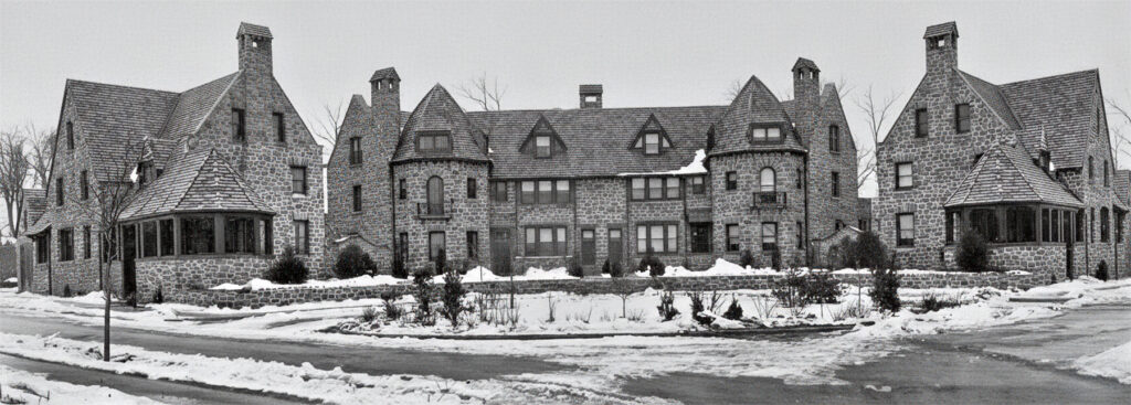 Group 33, located at the junction of Middlemay Place and Bow Street, exemplifies the architectural and practical benefits of the “Group Plan” in Forest Hills Gardens. This design approach is particularly effective for the community’s signature curvilinear streets and irregular plots, where traditional straight-line housing would appear discordant.