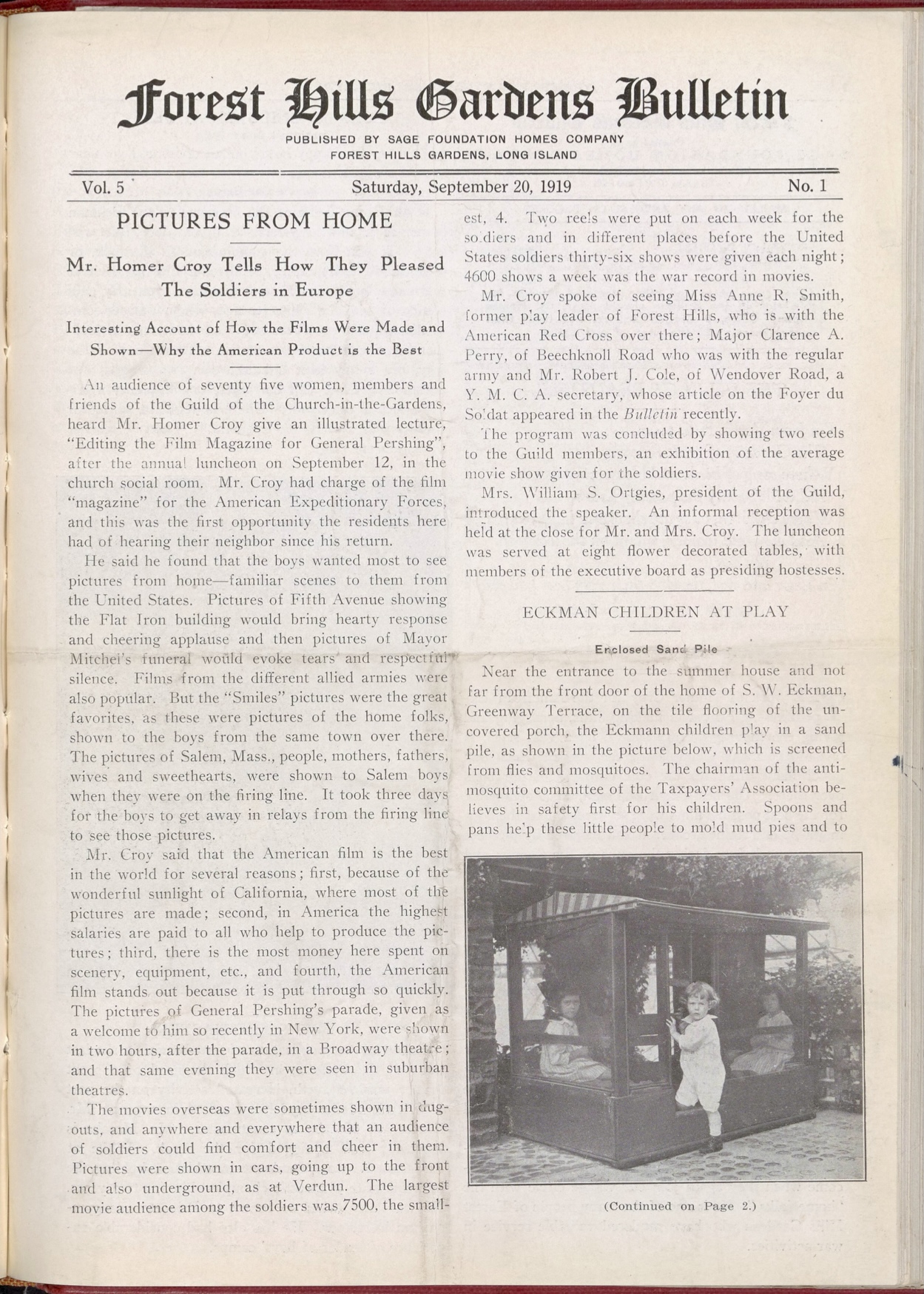 In late 1919, the Forest Hills Gardens Bulletin portrays a prosperous community grappling with post-World War I realities. A key article details a speech by banker Frank A. Vanderlip, who describes the dire economic situation in Europe and growing labor problems at home, yet remains optimistic about America’s future.